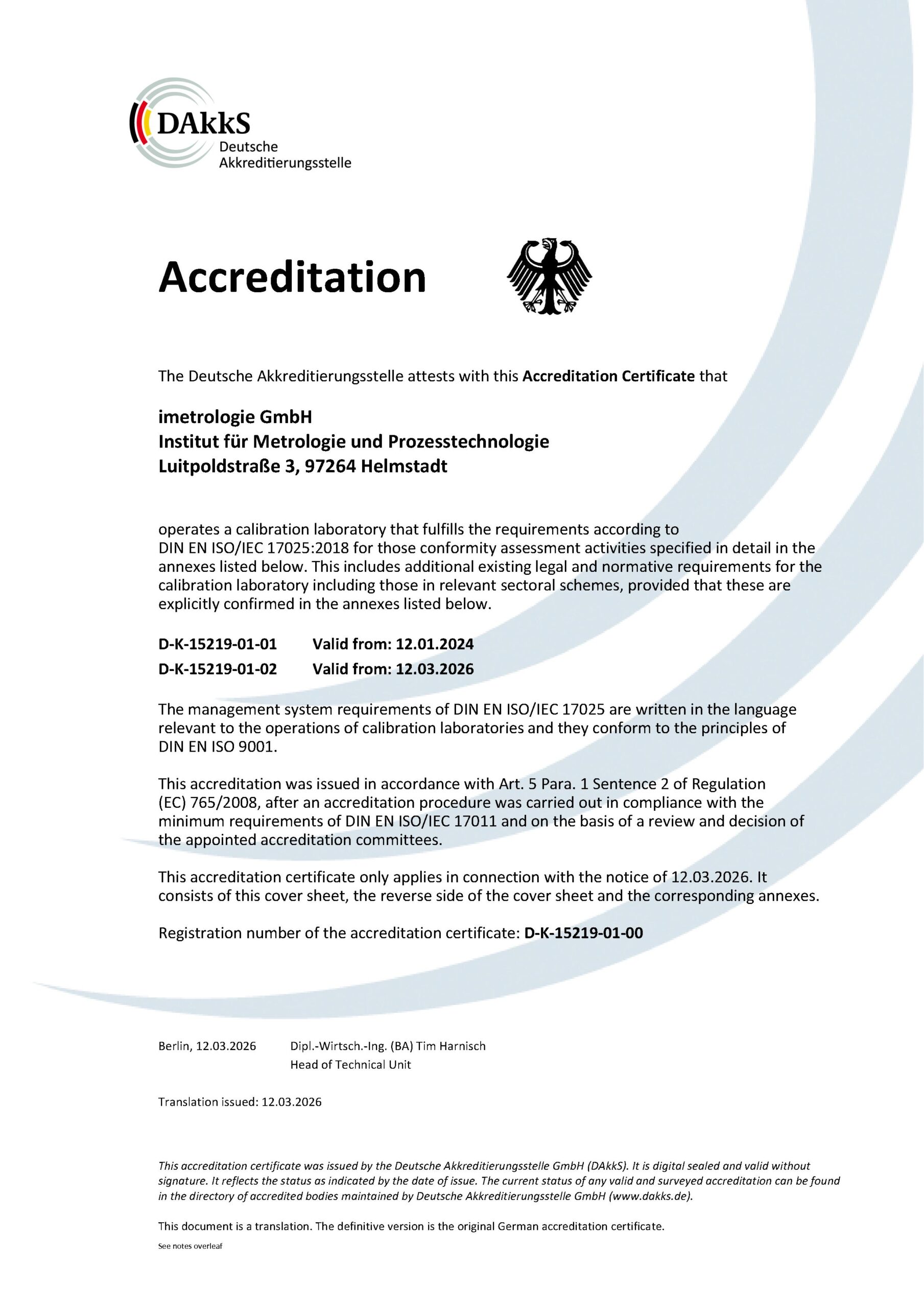 In the last 10 years, we have successfully performed numerous calibrations and adjustments for our customers from all over Germany. The Deutsche Akkreditierungsstelle GmbH (DAkkS) confirms our competence according to DIN EN ISO / IEC 17025:2018 for our thermodynamic, mechanical and electrical measurands.